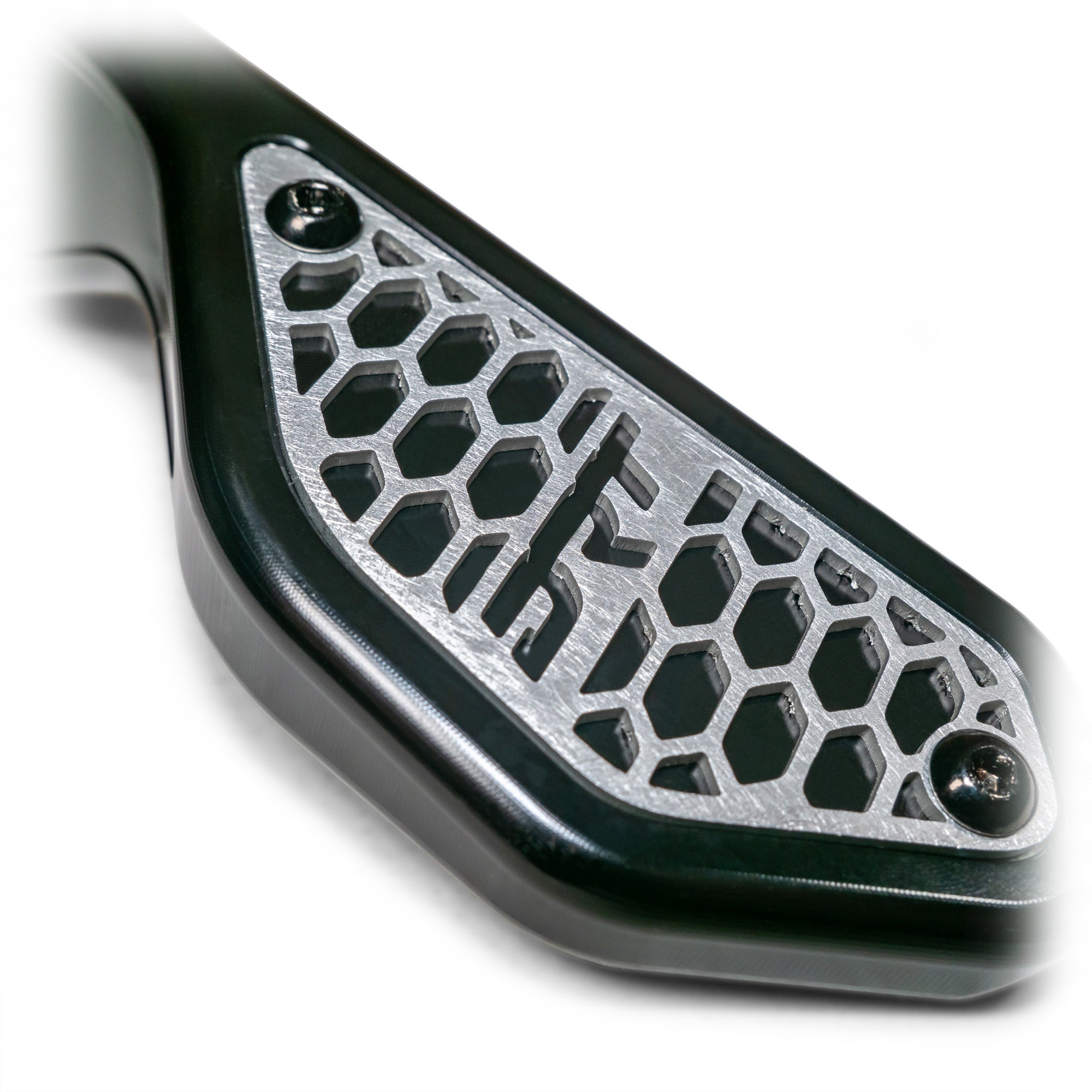 The OEM steering wheel adjustment lever (P/N 709402638 & 709403259) have a tendency to break due to their thin plastic construction. This leads to a steering wheel that is not locked into a correct position or is left flopping without the ability to tighten. We have made a billet aluminum replacement lever that can take all the use and abuse you can throw at it. Made of 6061-T6 aerospace-grade aluminum and a press-fit stainless steel locking cam gear, this part is built tough. We have added a laser-cut mesh panel to match the DRT styling used on our Maverick R components.