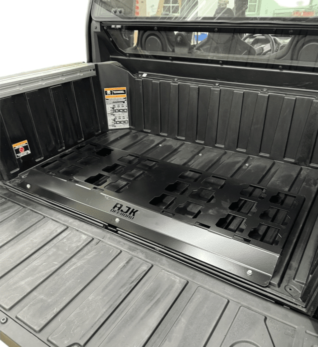 Our Milwaukee Packout Mount is the perfect storage solution for your Polaris Xpedition. This is our rear-mounted version, designed to sit toward the back of the bed near the tailgate. It uses existing mounting holes along with two self-drilling screws for added support. Installation is quick and easy—simply remove three bed bolts and replace them with the supplied bolts, then fasten the rear of the mount using the two included self-drilling screws. We CNC laser-cut our Milwaukee Packout Mount in-house from 10-gauge P.O. steel and finish it with a durable black powder coat.
