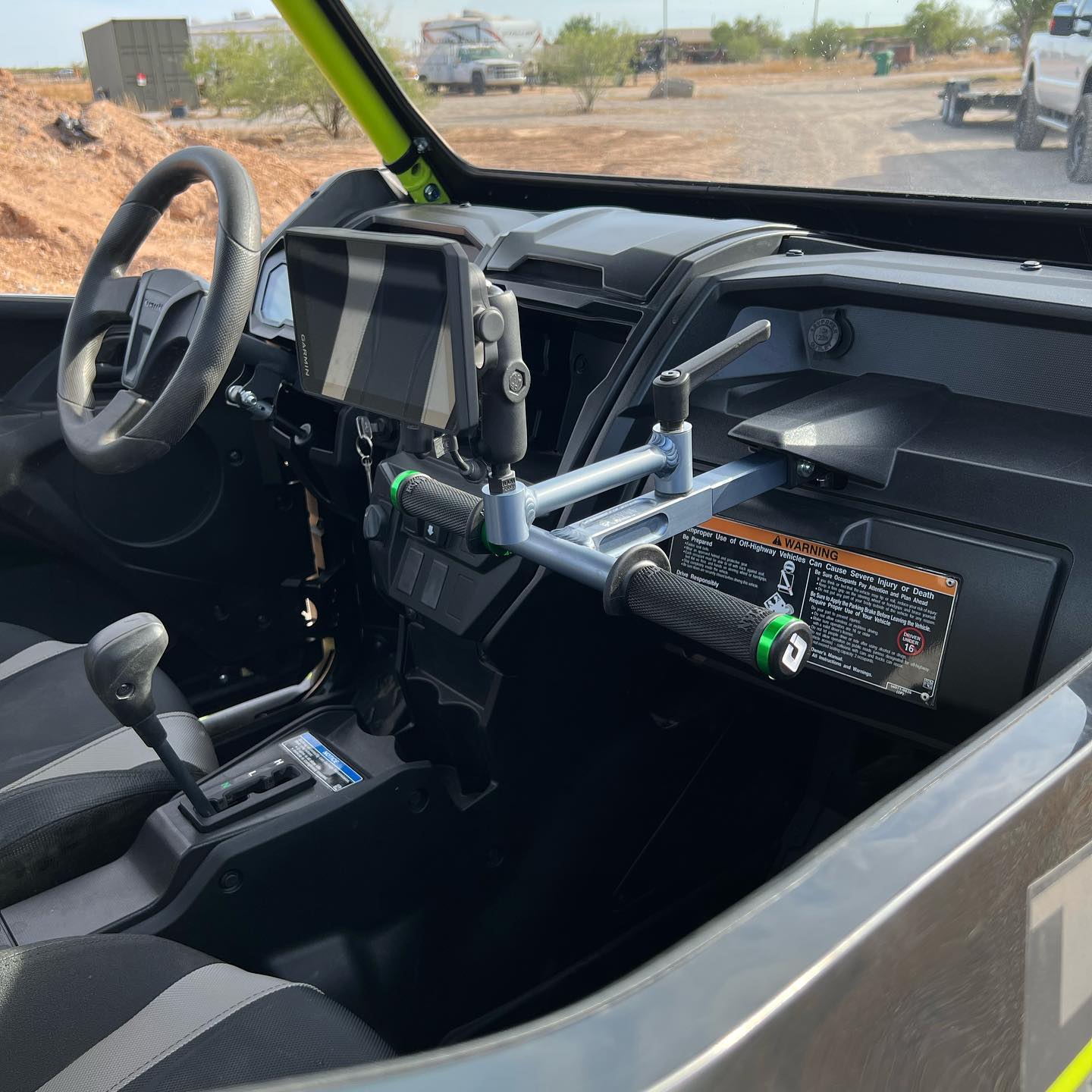 Here is our Kawasaki KRX Metal Head Mount! We have integrated GPS and accessory mounting into our billet passenger grab handles for the most versatility. You'll now be able to swivel the GPS from codriver to driver without any tools and also be able to touch your GPS while harnessed in. Here we are showcasing the new Garmin Tread 5.5 inch and 8 inch GPS units. It can also hold your phone, tablet or practically any other GPS using all of Ram Mounts accessories. Standard package includes grips, pivot rod, Ram Mounts "B" size ball, and all necessary hardware. All of our parts are made of CNC machined 6061 billet aluminum and tig welded for maximum strength and durability right here in the USA. We also have tons of custom options available for high end builds!
