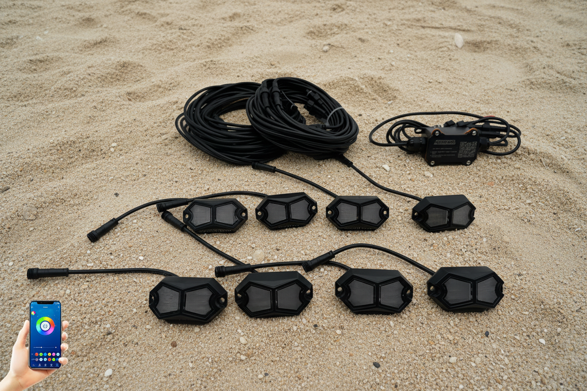 Marshin Whips is proud to introduce our new 8-Pack Personalized Rock Lights—the ultimate lighting solution for off-road vehicles! Designed for adventurers who demand both functionality and style, this set includes eight rock lights and one controller for seamless operation.